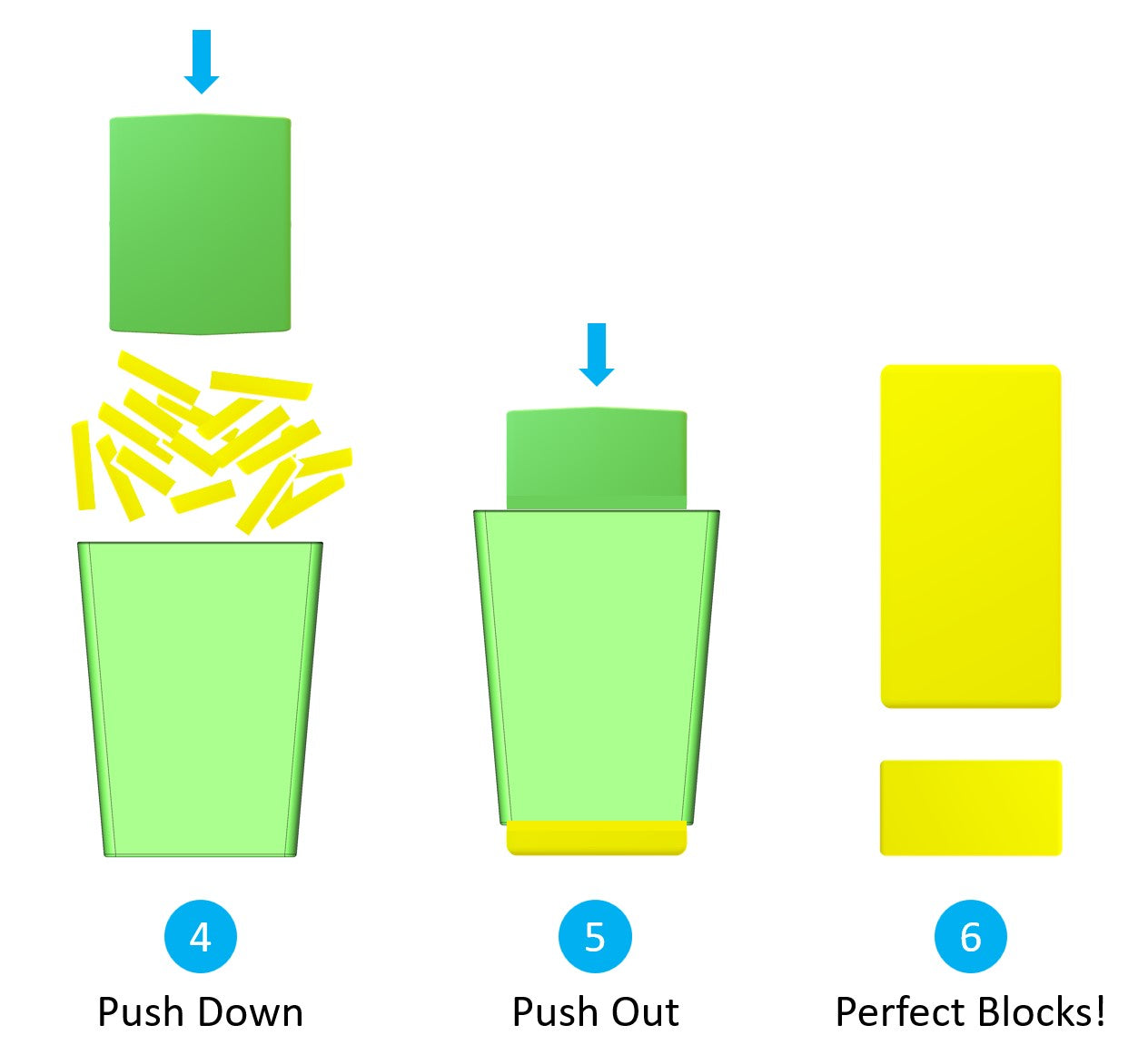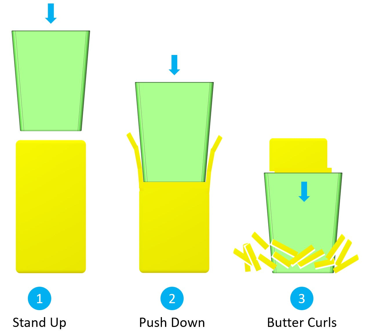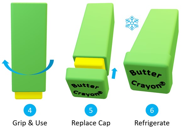 Put the left-over butter curls into the Butter Transformer and use the block to press them all together to create a second, smaller block that is the perfect width to fit into the Butter Crayon. Tip: Add cinnamon sugar, honey, or garlic for flavored butter.